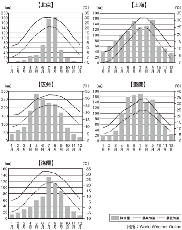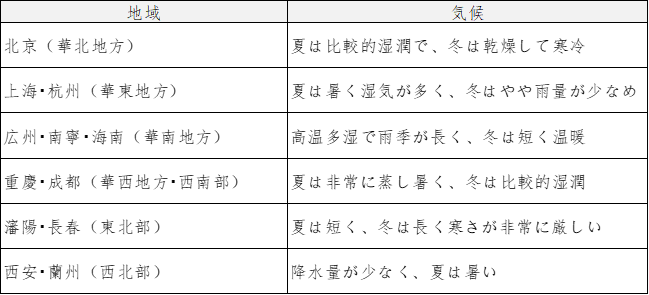 上海や杭州などは沿岸地域にあり、重慶や成都などは内陸の奥まった盆地にあります。北京は北緯40度に位置し暖温帯ですが、広州や南寧、海南は亜熱帯から熱帯に属します。各都市によって気候条件が異なる点が大きな特徴でもあります。