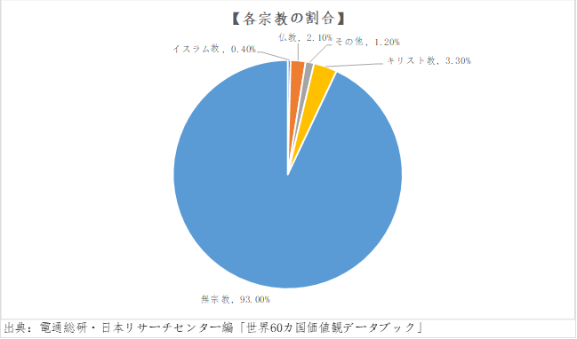 中国の主な宗教は、仏教、道教、儒教、キリスト教、イスラム教などです。しかし、統計上はその信者全てを合計しても人口の1割未満であり、多くは無宗教です。欧米的宗教観とは異なり、多数を占める漢族が複数の宗教を生活に取り入れていることや、儀礼や伝統的習慣としての浸透を宗教と見做さない傾向にあること、文化大革命時代の宗教弾圧による影響などの理由で、宗教的な国ではないと言われています。もっとも、憲法では信教の自由は認められており、実際には多くの仏教寺院があり、祭礼が行われています。