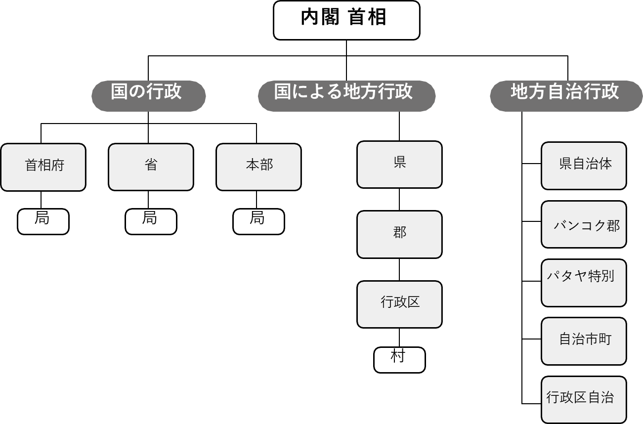 地方行政は、県(チャンワット)、郡(アンプアー)、町(タムボン)、村(ムーバーン)という内務省を中心とする中央政府の直接的な監督下にある縦割りの地方行政単位と、特別法に基づく自治市町、県行政機構、区行政機構、バンコク都、パタヤ特別市といった地方自治体が混在しています。