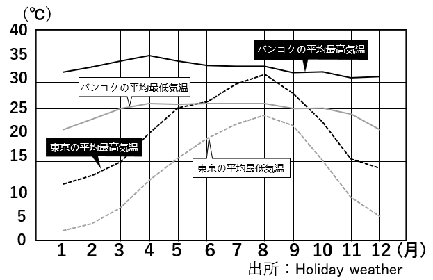 ・乾季(11月~2月):比較的涼しく、12月のバンコクの平均気温は25~30℃。