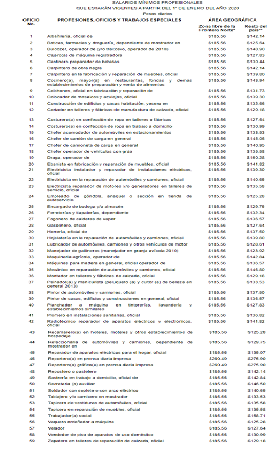 また、この上昇に伴い職業別最低賃金(Salarios Mínimos Profesionales)も2020年1月1日より以下のようになります。