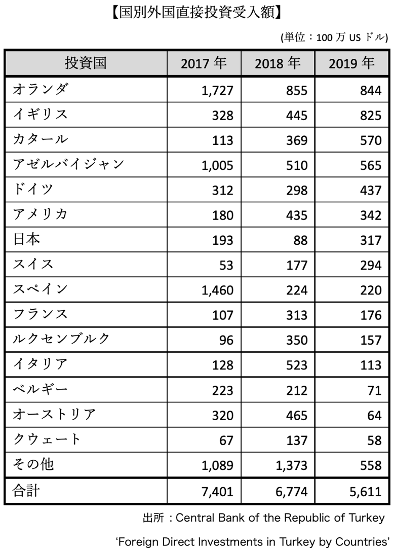 トルコ中央銀行(TCMB)の国際収支統計によると、2019年における対内直接投資額は56億1,100万USドルで、