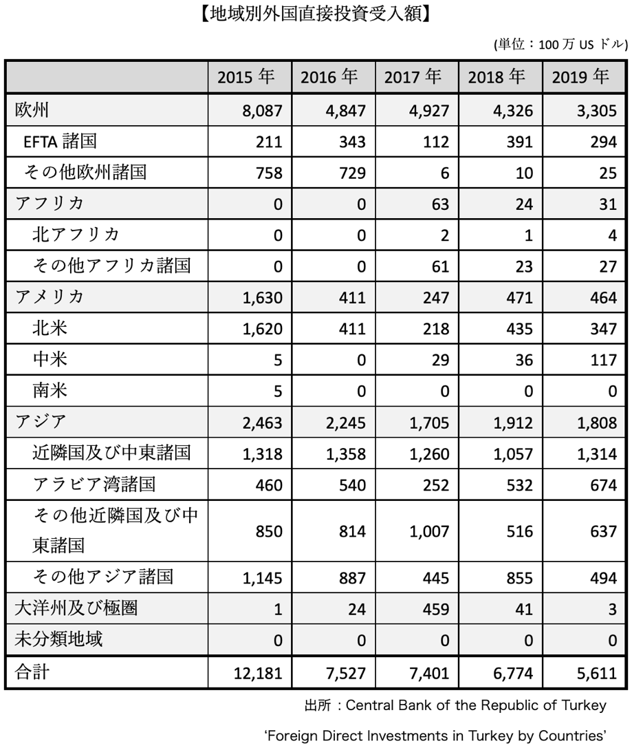 直近数年間における国別・地域別の外国直接投資(FDI)受入額は、下記の表の通りです。