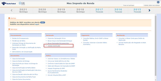 実際に登録後、サイトに入っていただくと、下記の画像にあるように“Meu Imposto de Renda” - "Declarações" - "Acessar Carnê-Leão"の順で手続き画面にアクセス可能です。