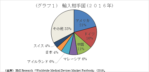 医療機器の輸入相手国について国別に見ていくと、上から順に、アメリカ、ドイツ、中国が上位を占め、日本はスイスと同一で4%を占めています(グラフ1)。アジアからの輸入は全体の20%近くであることが分かります。