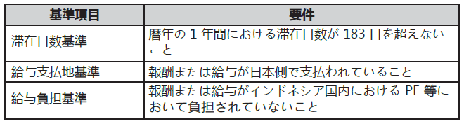 つまり、勤務実態がない国での給与所得に対しては課税されません。日本からインドネシアに出張し、給与の支払いを受けている場合、以下の要件をすべて満たすときは、支払われる報酬または給与についてインドネシア側では課税されません。