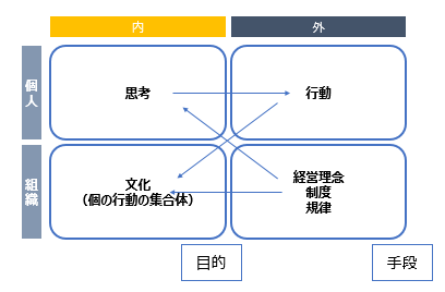 次に、上の図を使って、インテグラル理論を経営に応用して考えてみます。