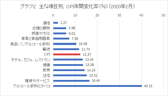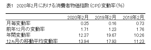 2020年2月における消費者物価指数(CPI)(2003=100)は、前月比0.35%、前年同月比12.37%、上昇しました。