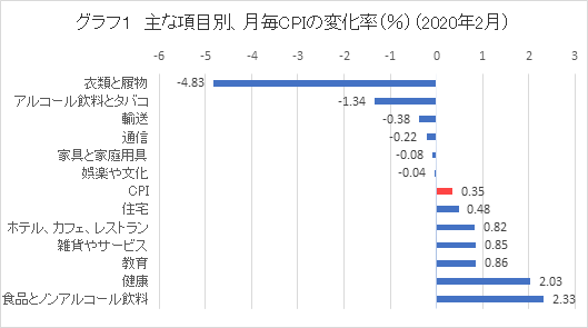 前月と比べた2月の消費者物価指数(CPI)で最も減少率が高かったのが、衣類と履物で-4.83%でした。