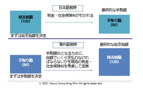①と②を比較した場合、①のケースを選択する会社が多いです。その理由としては、日本側にて引き落としが必要なものや引き落としされるもの(例えば、社会保険料や持株拠出金など)があるためです。ですので、引き落とし分を日本側支給の給与とする場合や、給与全額のうち3割日本負担や5割日本負担、といったかたちで割合を決める場合があります。