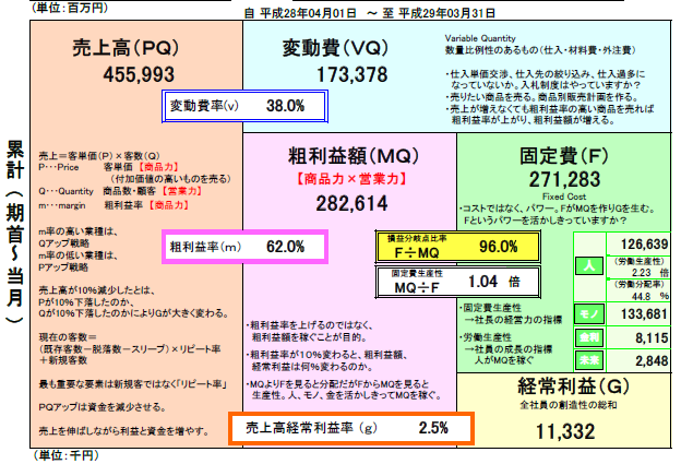 まず企業の業績を、売上高、変動費、粗利益、固定費、経常利益の五つに分解します。