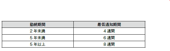 なお、雇用者と労働者の間に通知期間についての書面での合意がない場合には、上記雇用法の期間が適用されることになります。