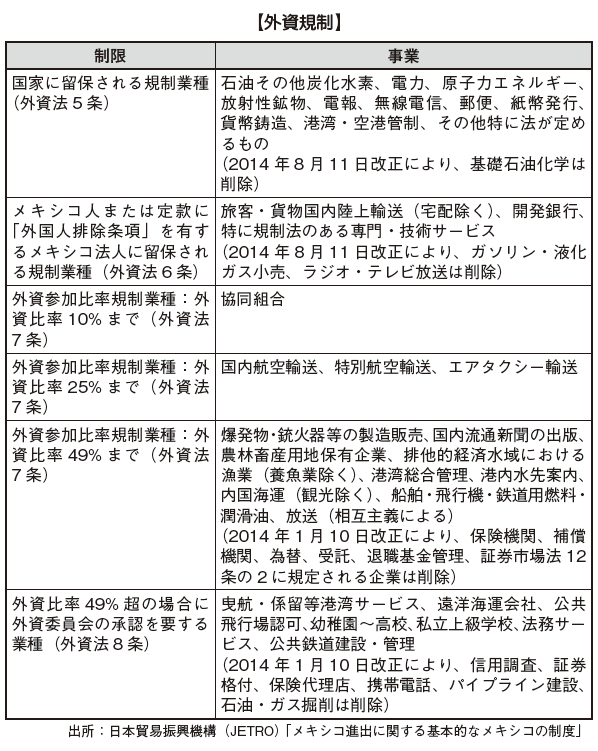 エネルギー改革に関する連邦憲法改正に伴い、2014年4月30日、連邦政府は関連法令の改正案を議会に提出しました。外国投資法に関しても、エネルギー業界への外国投資を奨励すべく、同業界への外資規制が緩和される方向で改正が行われました(2014年8月11日改正)。