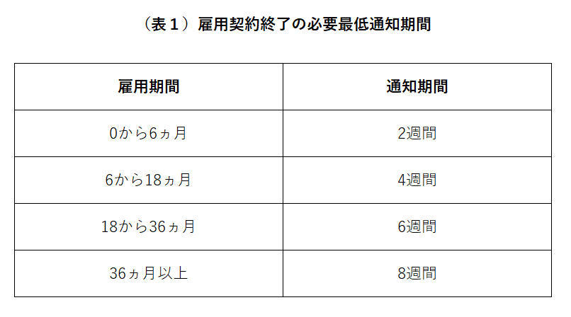 雇用主は、下の表1に示されている通知期間に基づき、無制限の雇用契約を終了することが可能です。万が一、雇用主が、この通知期間を守らずに通知を行わない場合、通知期間に相当する補償金を支払う義務が発生します。