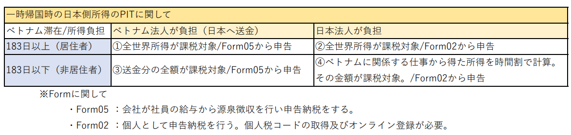 ・日本に半年未満の滞在 = ベトナムでは居住者 → 全世界所得が課税対象