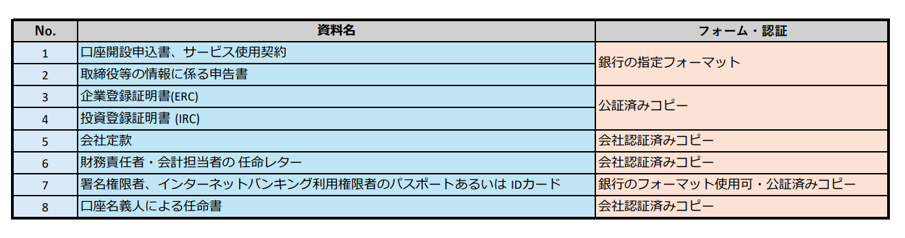通常、日系企業の場合、口座名義人は、現地の法定代表者が一般的となります。 口座名義人を日本側親会社の代表にすることも可能となりますが、各種銀行手続きに口座名義人 および Chief Accountant (財務担当者)の署名 および 会社印捺印が必要となりますので、日本側親会社の代表の登録は実務上適当でないとの形になります。