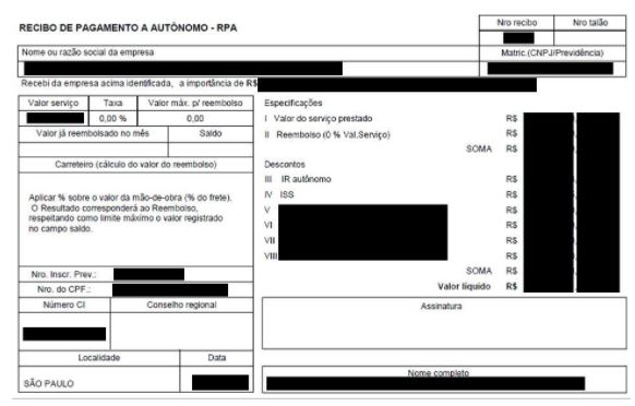 自社や自営業者の基本情報(CNPJ、CPF、名前、住所等)のほかに、サービス金額、各種税金金額、実際に自営業者に支払う金額等が記載されたものとなります。