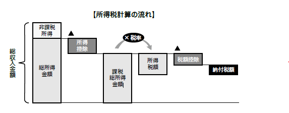 ①の総所得金額から各種所得控除額を控除し、課税所得金額を算出します。