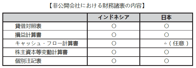 年次報告は、財務諸表と事業報告に分けられます。財務諸表は、貸借対照表、損益計算書、キャッシュ・フロー計算書、株主資本等変動計算書、個別注記表の5種類を作成しなければなりません。インドネシアでは、すべての企業においてキャッシュ・フロー計算書を作成する必要があり、この点が日本と異なります。また、財務諸表はインドネシア会計基準に従って作成されなければなりません。