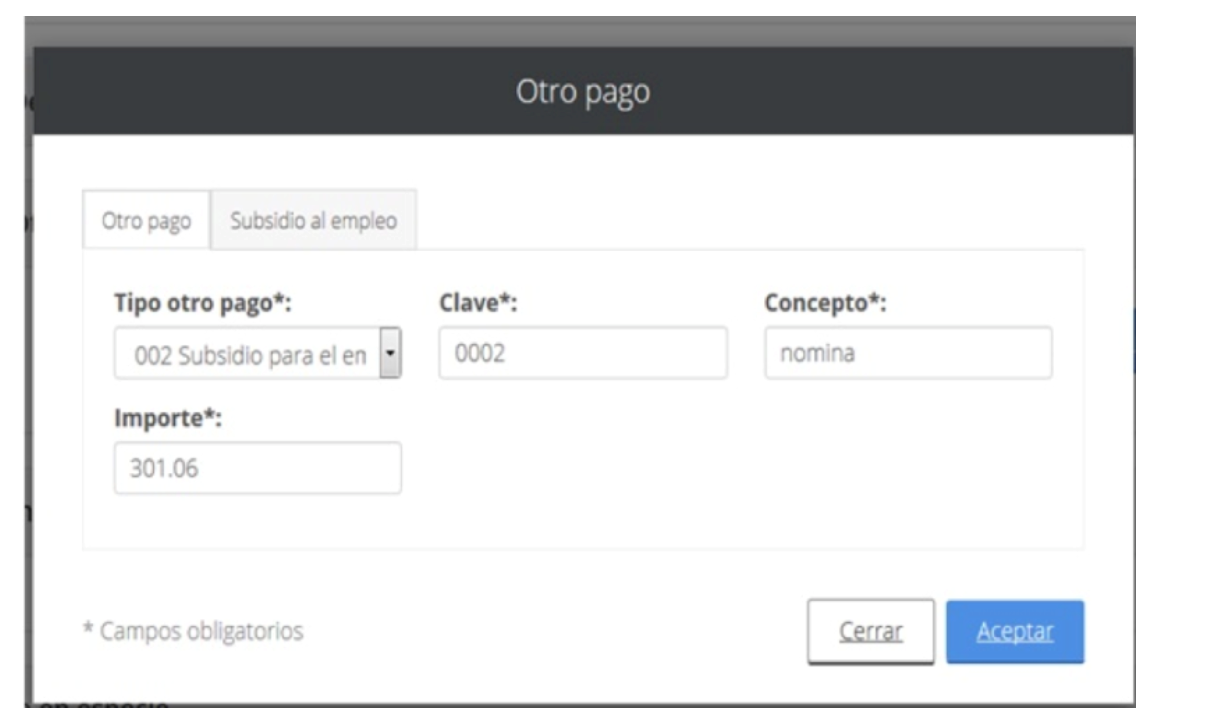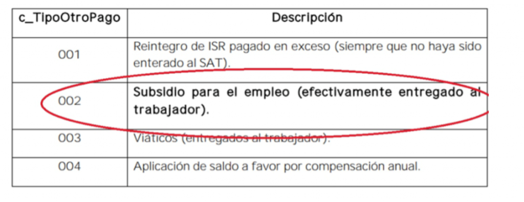 まずCFDIでは、雇用補助金は、「その他の支払いの種類」で実際に労働者に与えられる雇用補助金はコード002に反映される必要があります。