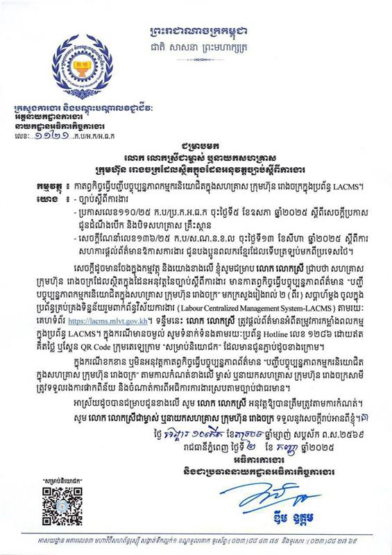 カンボジア労働省(Mistry of Labor, Department of Inspection)は、2025年9月2日付の通知書(No.112.1…K.B./A.K.I.A.T.)において、以下の義務を企業に課す旨を発表しました。