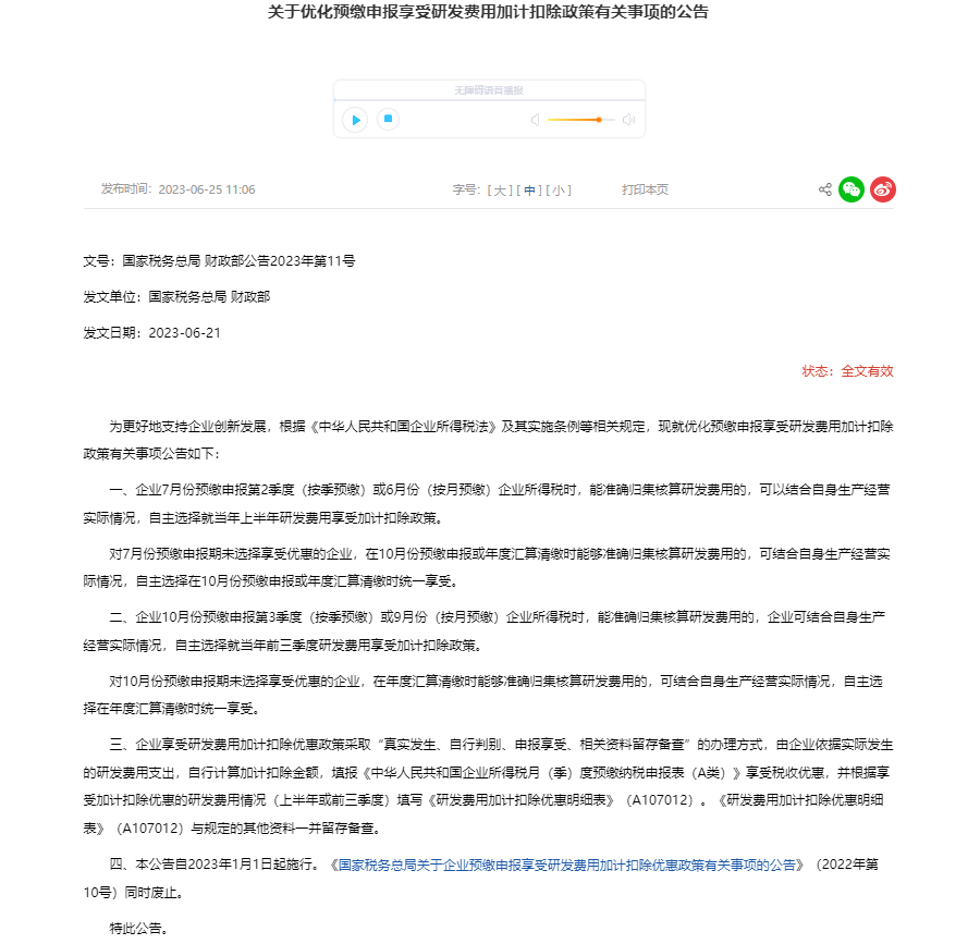 2023年6月25日、≪关于优化预缴申报享受研发费用加计扣除政策有关事项的公告≫(财政部公告2023年第11号)が発行された。