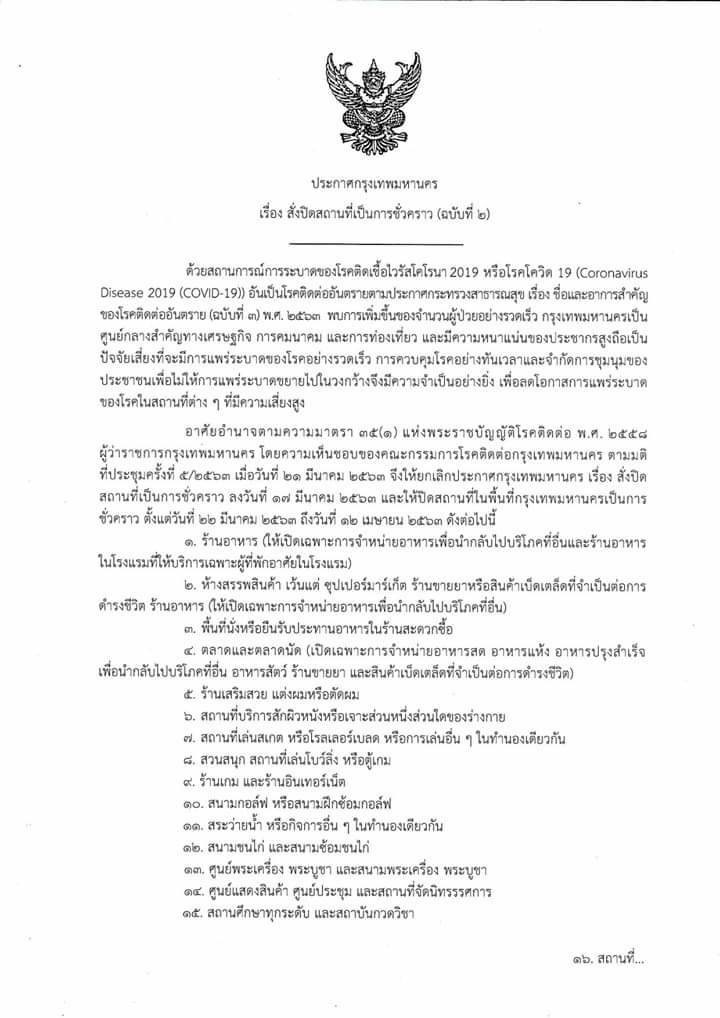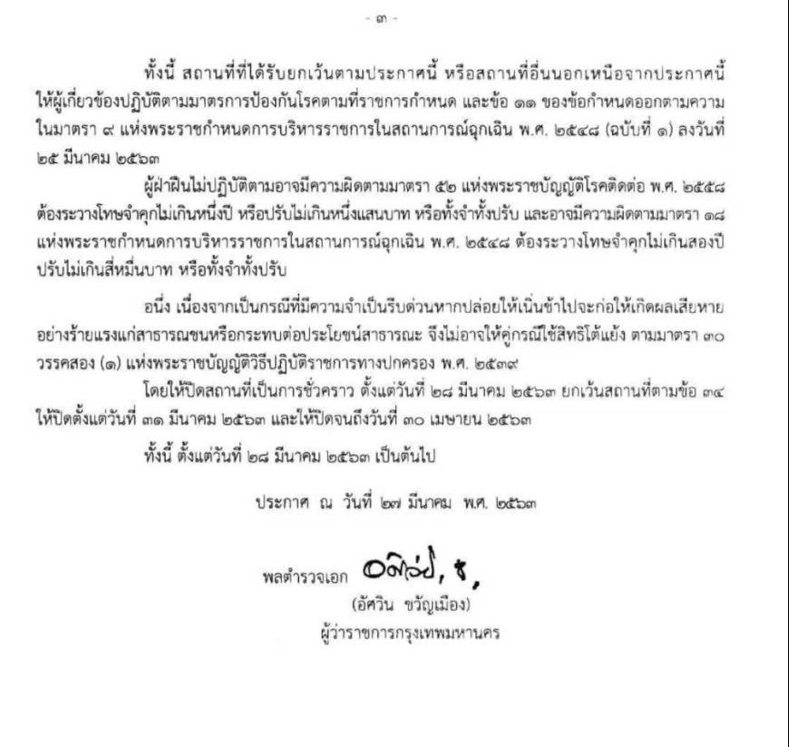 3月22日~4月30日の間、COVID-19による感染を防ぐため、バンコク都内の施設を封鎖することを発表しました。