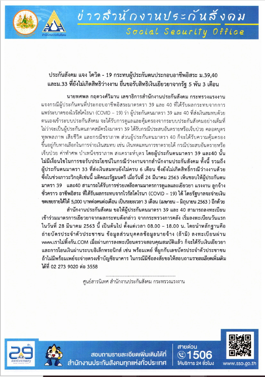 タイ国内でのCOVID-19の感染拡大に伴い、社会保険局から発表された給付に関し、以下にて共有させて頂きます。
