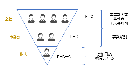 会社を大きく分けると上記の3つのカテゴリーになります。それぞれにPDCサイクルがあるのですが、PDCサイクルの中でも特にD(実行)の検証が重要です。その検証すべきDというのは、上記の図の中にある全社、事業部、個人の中でも個人レベルのみでしか作れません。PDCサイクルを回す際に、個人レベルでは、評価制度を使いますが、評価制度というのは全社のPDCを最終的に落とし込んだものが評価制度です。つまり、子会社のローカライゼーションを考える際に、これだけを分離して切り離してはいけないのが原則です。