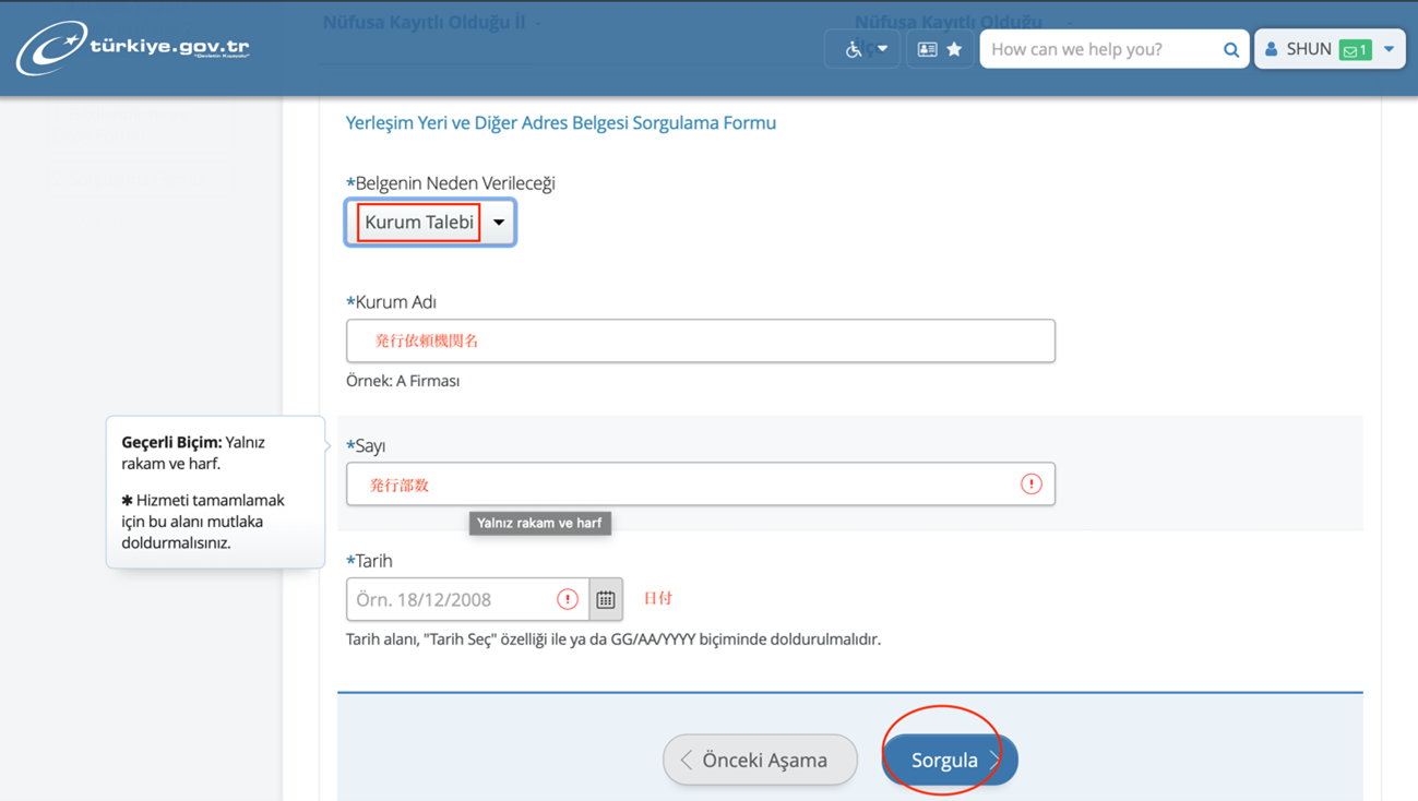 5) 進んだ画面にて’Kurum Talebi’を選択し、発行依頼機関名、発行部数、日付を入力後、最下部の青いボタン’Sorgula’をクリックすると住居証明が発行される