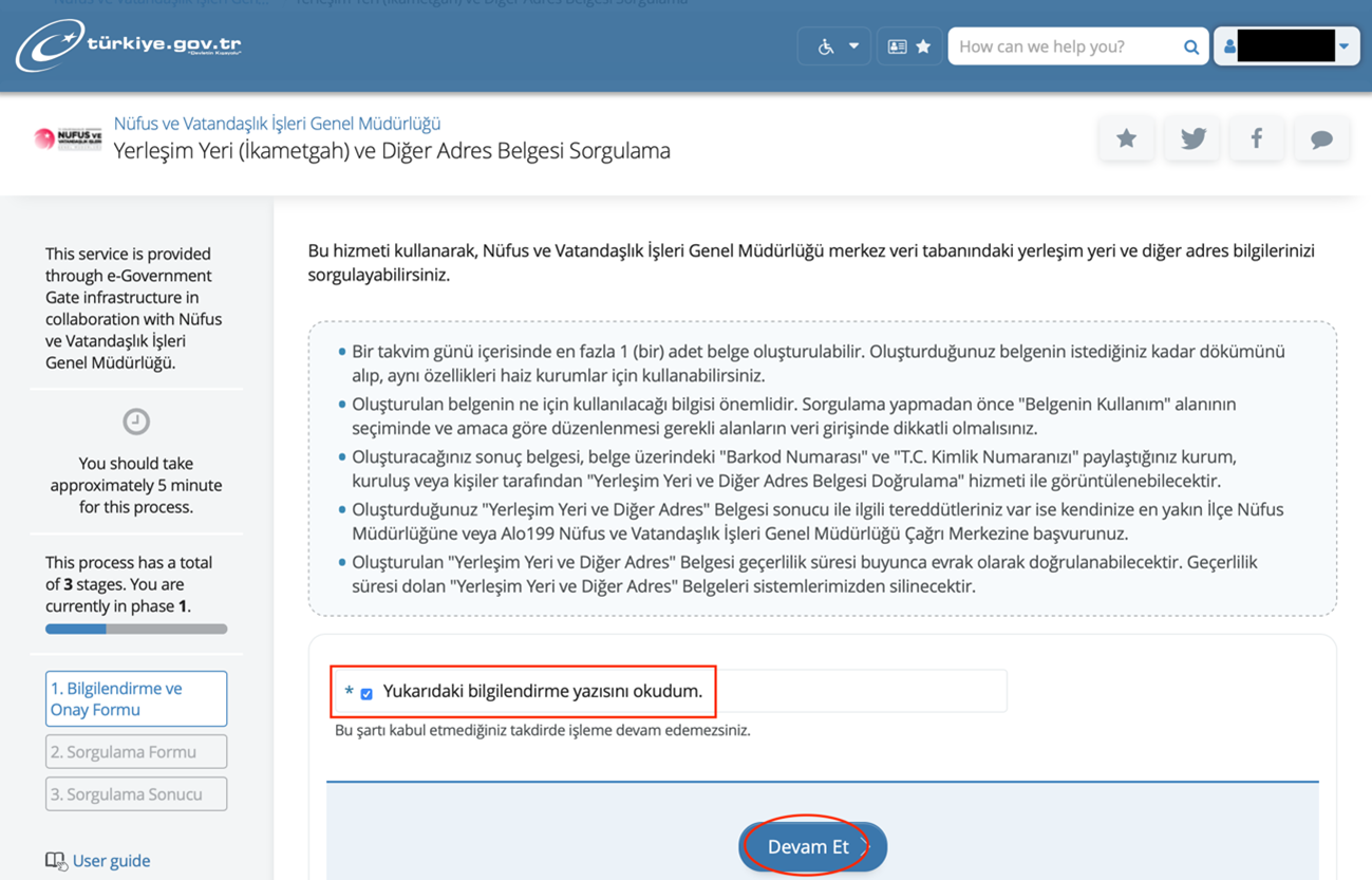 3) 下段’Yukarıdaki bilgilendirme yazısını okudum.’にチェックし、 最下部の青いボタン’Devam Et’をクリック