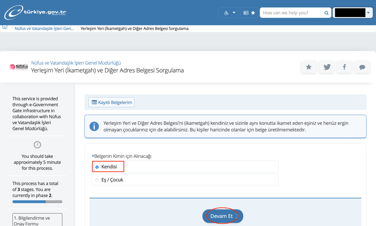 4) 進んだ画面にて’Kendisi’を選択し、最下部の青いボタン’Devam Et’をクリック