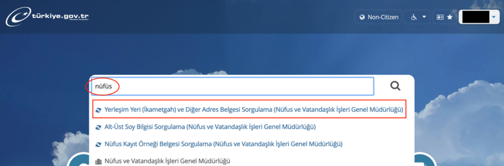 2) ログイン後、’nüfüs’と検索し、’Yerleşim Yeri’を選択