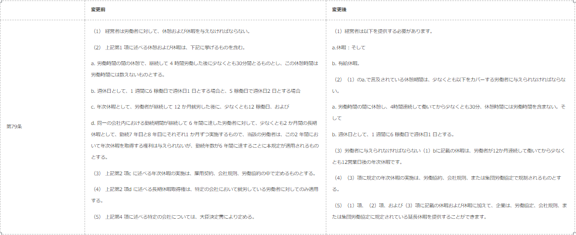 また、当該条文はオムニバス法による労働法の改正により削除されており今後はどの企業においても労働法の上では適用されません。注意点としましては、就業規則に該当の部分を引用し長期休暇を与えるという項目があると長期休暇を付与しなければならなくなりますので、オムニバス法による改正に合わせて就業規則の見直しを行うことをお勧めいたします。