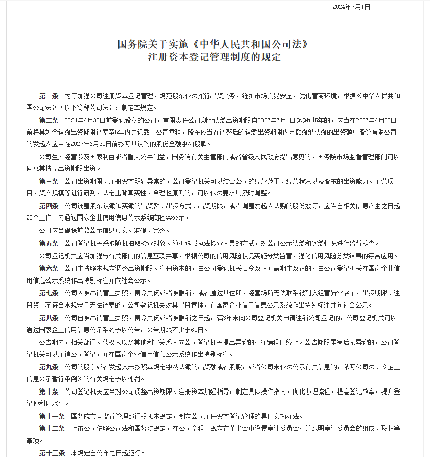 国务院关于实施《中华人民共和国公司法》注册资本登记管理制度的规定_工商_中国政府网 (www.gov.cn)