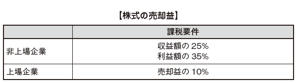 株式売却から生じるキャピタル・ゲインについては、普通所得とみなされ、通常の法人税率が課されます。メキシコ非上場企業の株式を売却する非居住者は収益額の25%、非居住者がメキシコに代理人を置いている場合(当該非居住者がタックス・ヘイブンに立地していないことまたは優遇税制の恩恵を受けていないことを条件とする)は利益額の35%がそれぞれ課税されます。