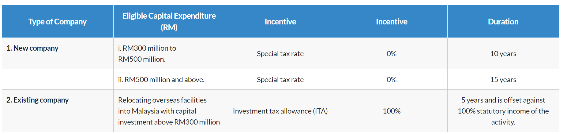 - 10年間の査定期間中所得税率0%の承認には少なくとも3億リンギット。または