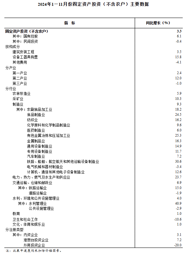 2024年1月から11月にかけて、全国の固定資産投資(農家を含まない)は465,839億元で、前年同期比3.3%増加となりました。