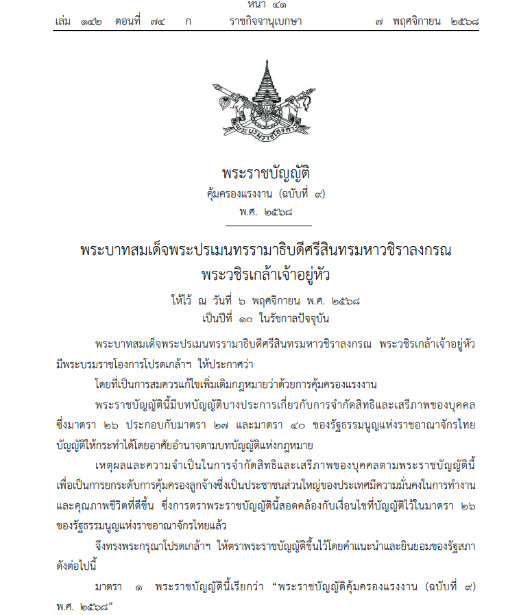 2025年11月7日、タイ政府は「労働者保護法(Labour Protection Act)」の改正法(No.9 B.E.2568(2025))を官報に掲載しました。